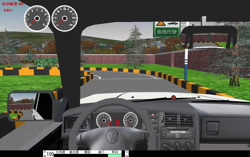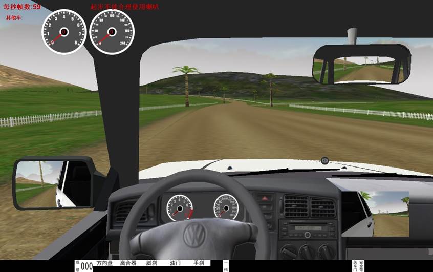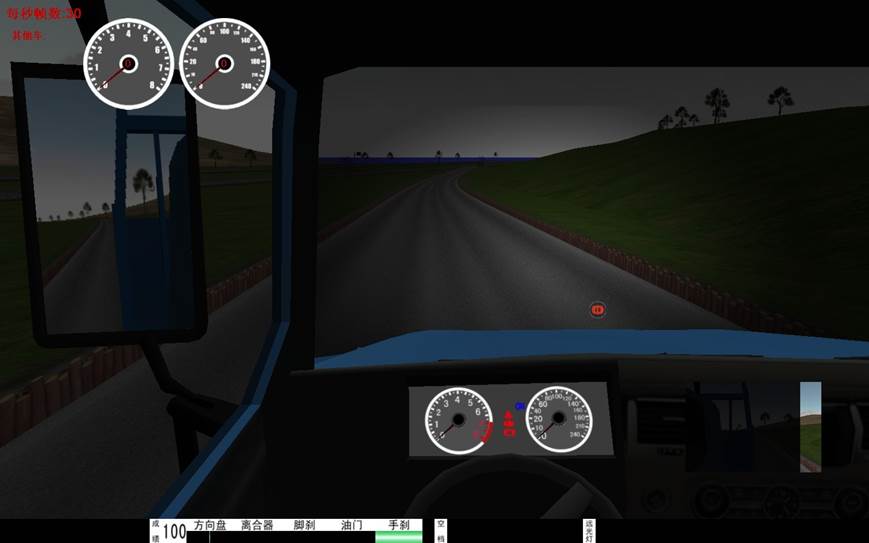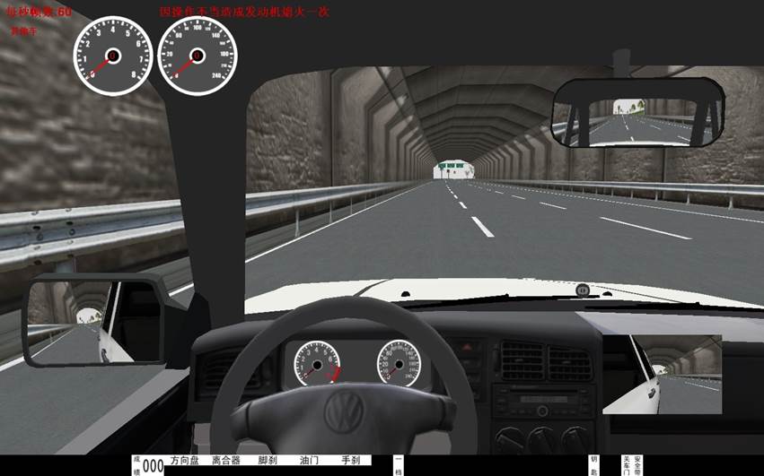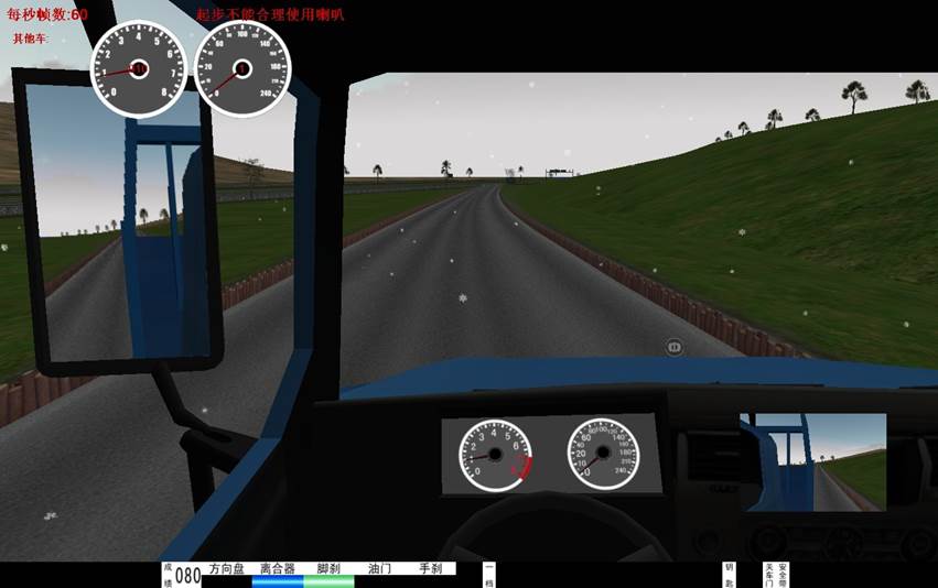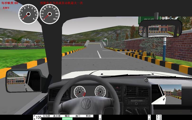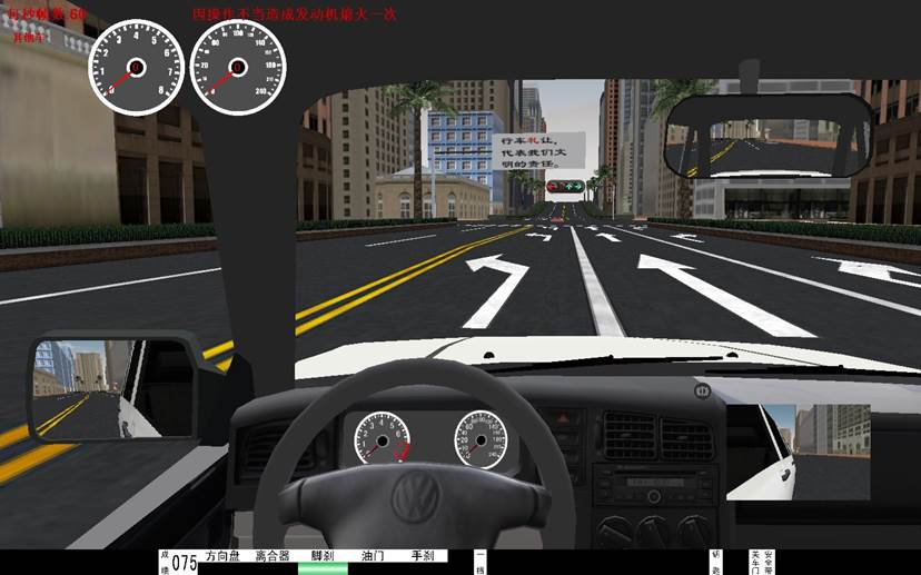 5、界麵(miàn)顯示 :檔位顯示,訓練成績,後視鏡(左、右、中)、逼真汽車儀(yí)表(車速、裏程、發動機轉速)、場景地(dì)圖。在訓練過程