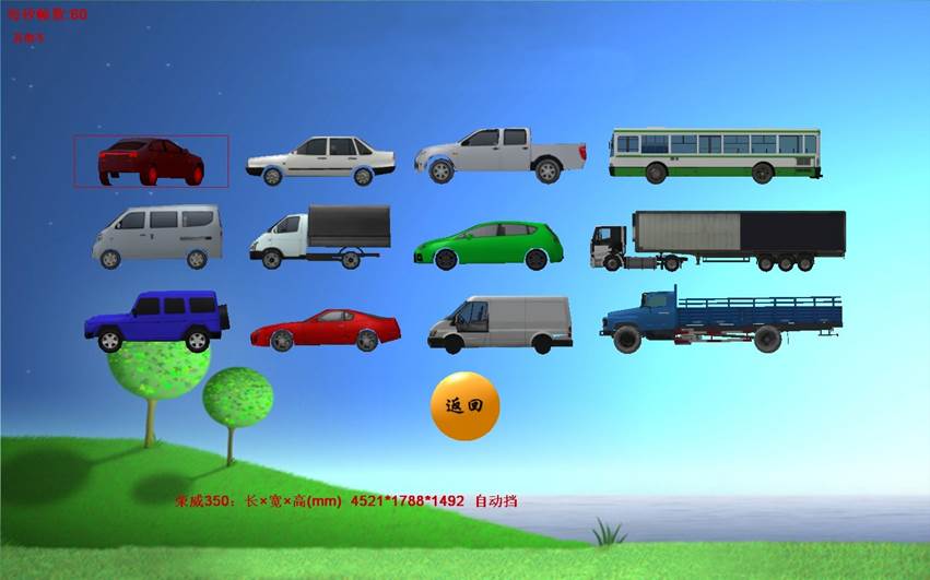 4、訓練(liàn)車型選擇 :學員可以選擇“桑塔納”、“吉普車”、“無級變速車(自動檔)”、“東風車”、“大客車”、“農用車”作為訓練車輛,在模擬器上體會不同車型的特點。
